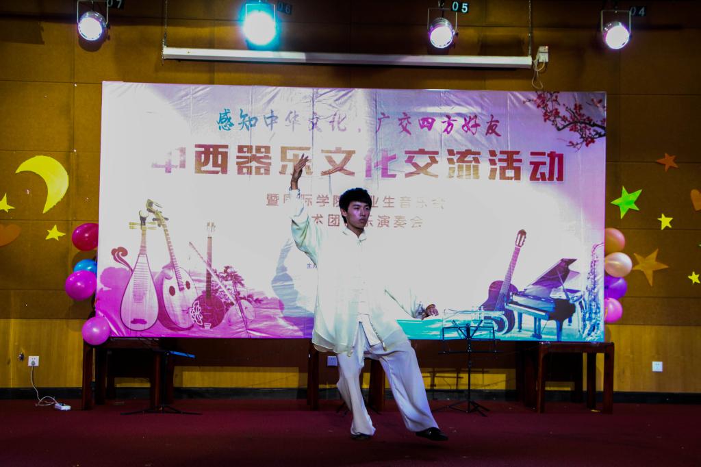 活动中,中外学生都沉浸在美妙的音乐旋律之中。其中,来自俄罗斯的2015级针灸推拿专业留学生波丽娜同学的吉他演奏更是将活动推向了高潮。同时,来自马来西亚的2014级中医学专业“功夫小子”林元凯带来的音乐太极表演也博得了阵阵热烈的掌声。