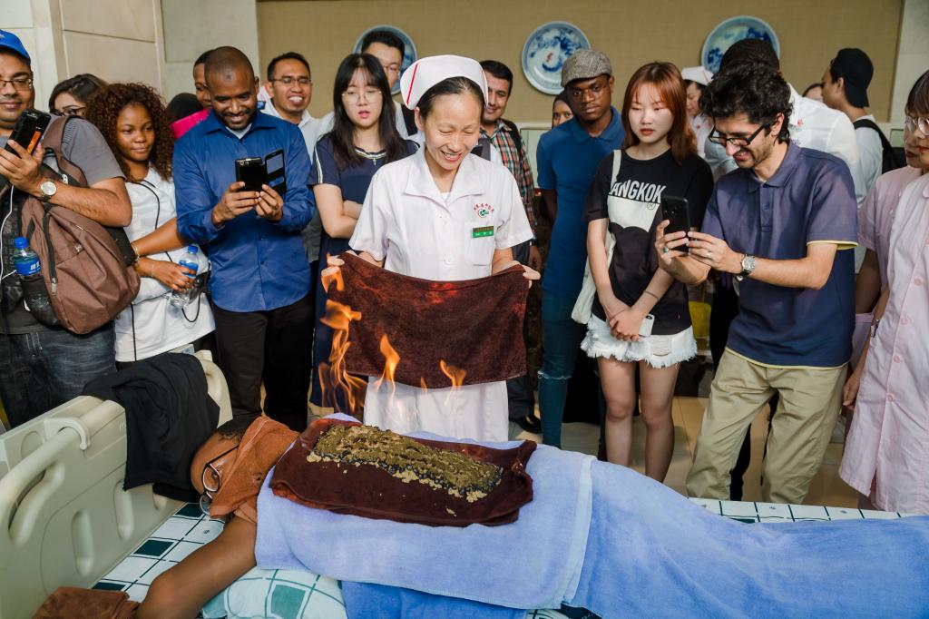 中医药文化探究第二站——“药王飘香”。同学们来到了广东中医药博物馆和广东省中医院大学城医院。在大学城医院,留学生们亲身体验了火龙灸、雷火灸、拔罐以及艾灸等多种中医药传统疗法。一位来自喀麦隆的留学生汤尼自告奋勇提出想体验火龙灸。他说由于缺少运动,长期久坐的他每天起床都感觉腰酸背痛,希望通过中医药疗法,缓解疼痛。当大火升起的那一刻,围观的留学生都惊呼了。但汤尼镇定地说“大家快来体验下,真的很好,很舒服。”