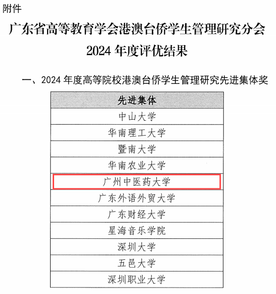 根据广东省高等教育学会港澳台侨学生管理研究分会发布《关于公布2024年度评优结果的通知》,我校荣获“2024年度高等院校港澳台侨学生管理研究先进集体奖”,阎敏、周静两位同志荣获“2024年度高等院校港澳台侨学生管理研究优秀个人奖”。