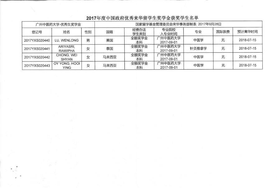 根据《关于做好2017年度中国政府优秀来华留学生奖学金表彰工作的通知》(教外司留【2017】2205)2017年度“广东省来粤留学生奖学金”奖学金发放事项。发放方式:奖学金将一次性发放至学生本人的中国银行卡中,请及时登录学校财务系统,完成银行卡的绑定工作。发放名单见附件。